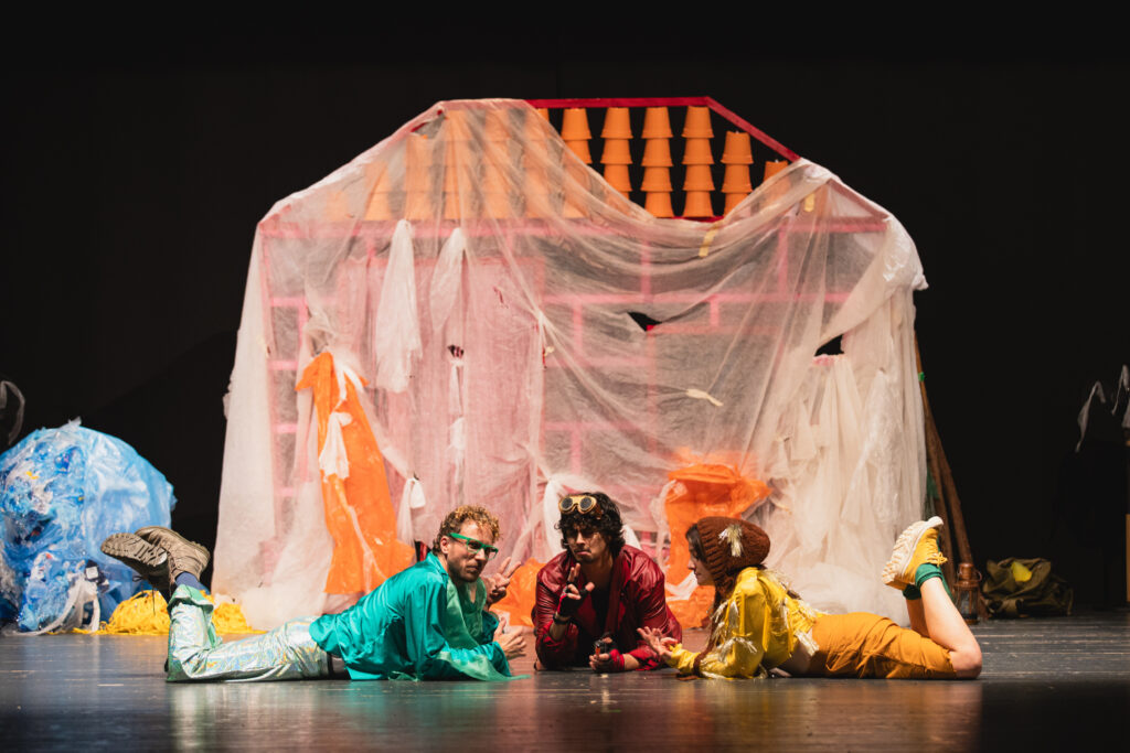 Una nuova narrazione della fiaba tradizionale. Il lupo cattivo ci offre uno specchio in cui guardarci: una società adulta che rischia di buttare giù ogni cosa. I porcellini sono bambine e bambini che si aiutano l’uno con l’altro per affrontare il vento lupesco. Si ascoltano, si accolgono, cercano qualcosa per rendere casa un posto che fino a un attimo prima non lo era. Si adattano e si preparano per un mondo che cambia, affidandosi alla magia del racconto e al calore dell’amicizia.